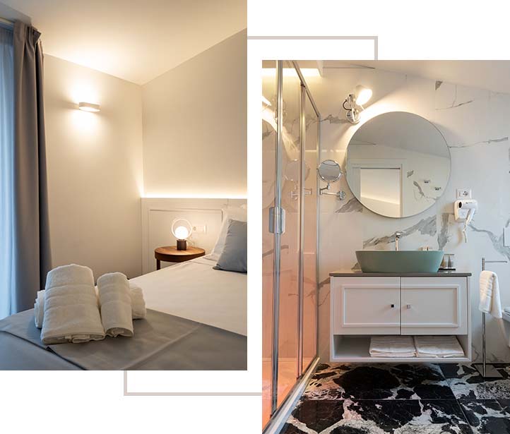 Le Superior , dotate di letto matrimoniale king size, scrittoio, bagno in marmo dotato di 2 soffioni con effetto pioggia e con cromoterapia, mini -bar, vassoio con bollitore, assortimento di tisane, macchina da caffè’ con cialde, servizio di colazione di cortesia, aria condizionata e riscaldamento, balcone attrezzato.